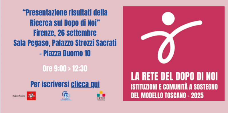 L’evento di presentazione dei risultati della ricerca sul Dopo di Noi (Scarica qui il Save the date) si terrà a Firenze il 26 settembre presso la Sala Pegaso di Palazzo Strozzi Sacrati in Piazza Duomo 10 dalle Ore 9:00 alle 12:30.